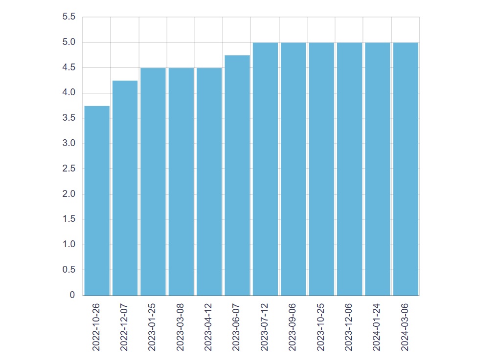 Governing Council decided to hold the policy rate at 5% and to continue to normalize the Bank’s balance sheet. The Council is still concerned about risks to the outlook for inflation, particularly the persistence in underlying inflation. Governing Council wants to see further and sustained easing in core inflation and continues to focus on the balance between demand and supply in the economy, inflation expectations, wage growth, and corporate pricing behavior. The Bank remains resolute in its commitment to restoring price stability for Canadians.